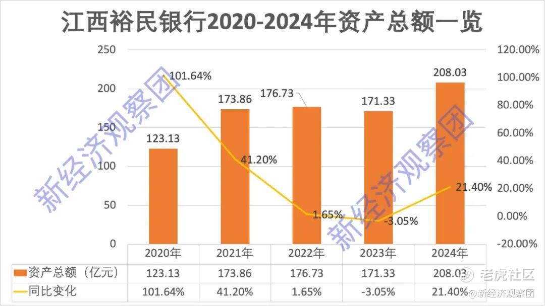 先从资产规模上看,2020年增长幅度超100%,表现亮眼。但拉长到五年来看,2020-2024年五年间,该行资产总额从123.12亿元增长至208.03亿元,五年间增长约70%,且资产总额在2024年19家民营银行中位于倒数第二,五年间增幅也低于同业。
