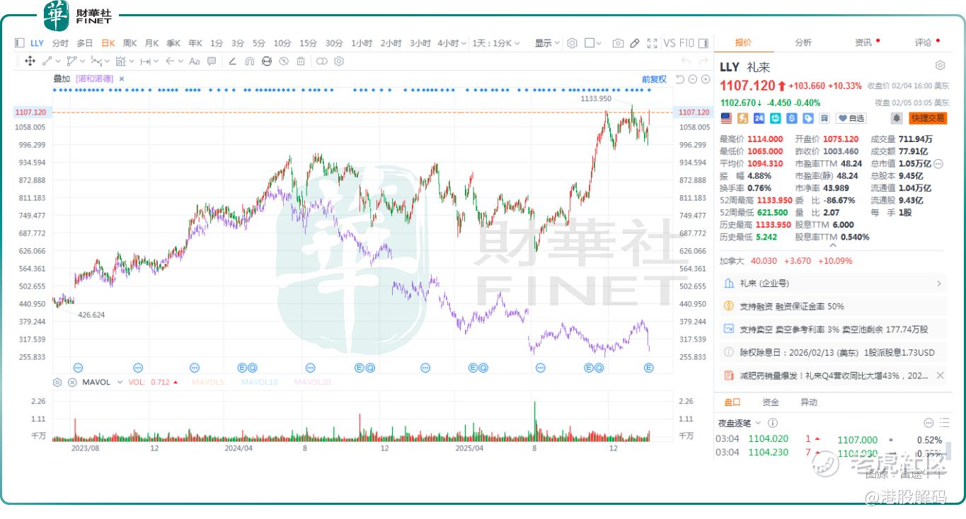 2月4日(美东时间),“减肥药双雄”股价走势再度分化: $诺和诺德(NVO)$ 延续此前跌势,跳空大挫6.18%;而 $礼来(LLY)$ 则走出截然相反的行情,股价跳空飙升了10.33%,逼近历史高点,表现显著强于诺和诺德。