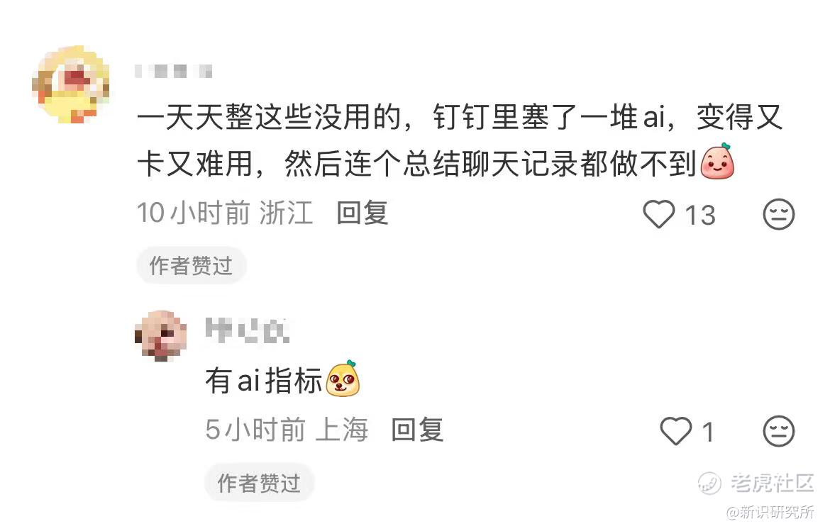 一位来自浙江的网友评论到:“钉钉里塞了一堆ai,变得又卡又难用,然后连个总结聊天记录都做不到。”