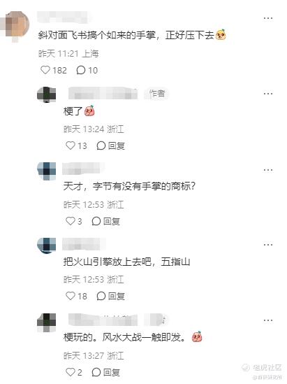 更有网友表示这可能和风水有关,其觉得或许钉钉开始相信风水了,而也有“天才”网友脑洞大开,开始给飞书那边“支招”,表示“飞书搞个如来的手掌,可以压下去”,最后搭配上火山引擎就筹齐了直接变成“五指山”。