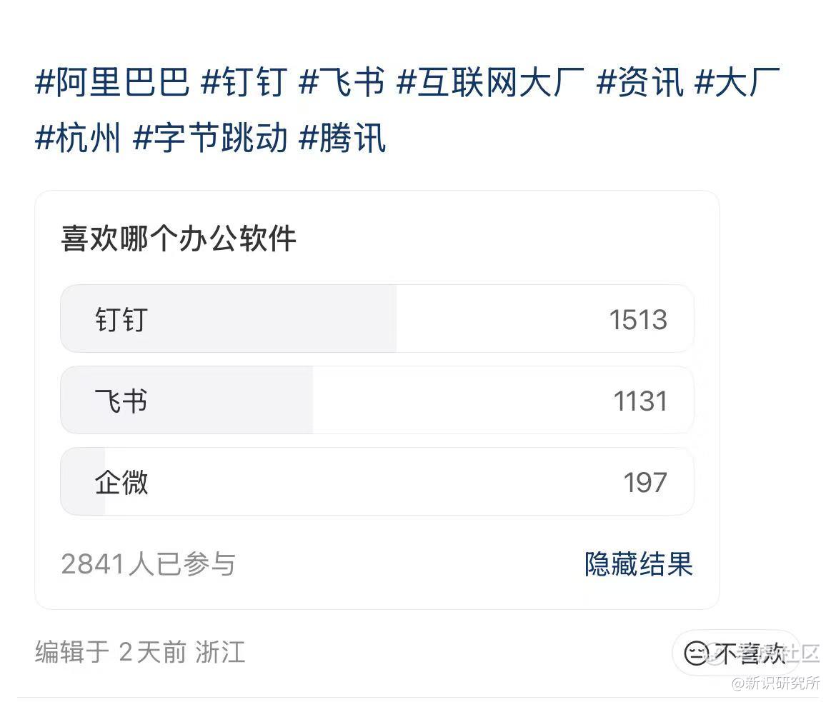 钉钉以1513票居一号位,飞书、企微分别以1131和197票居二三名,总共也就这三个选项。