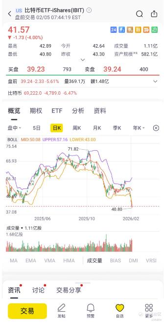 最近这轮比特币与加密市场的暴跌,好吓人啊,一天一个价位啊。 $比特币ETF-iShares(IBIT)$ 也跌到了差不多一年来的最低区域了,从技术上看,好像已进入“可操作区”,虽然尚未确认反转,从股票图上看,目前IBIT 价格在41.57,日内最低 40.80,已经跌破了DD1(那个橙线),也触及,或者说已经击穿了BOLL下轨(43),MACD与RSI等动量指标均呈现深度负值,显示短期抛压已接近极致,成交量明显放大。