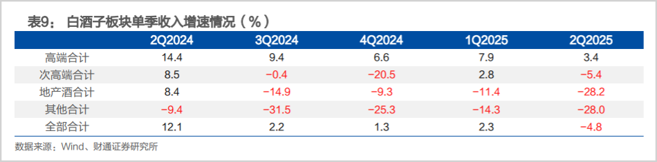 在行业调整期,不同定位的品牌酒企收入也呈现出较大差异性。据财通证券研究,自2024年第二季度至2025年二季度高端白酒的单季度收入虽然有所下降,但始终维持在正值,表现较为稳定。