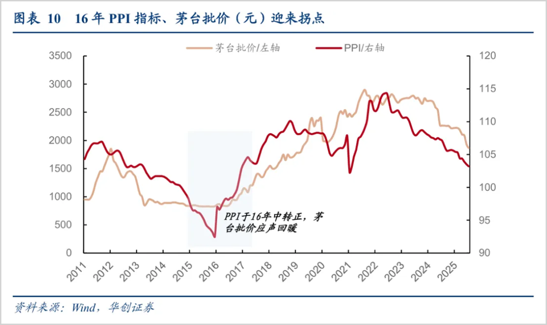 据华创证券研究,以茅台批价和PPI走势进行对比,2016年春节后白酒在二季度批价有所回落,行业仍存在“反弹还是反转”的分歧,但随着年中PPI增速转正,茅台批价从2016年下半年起震荡走高并于年底站上千元,随后头部酒企利润表开始好转,正式标志着新一轮周期开启。