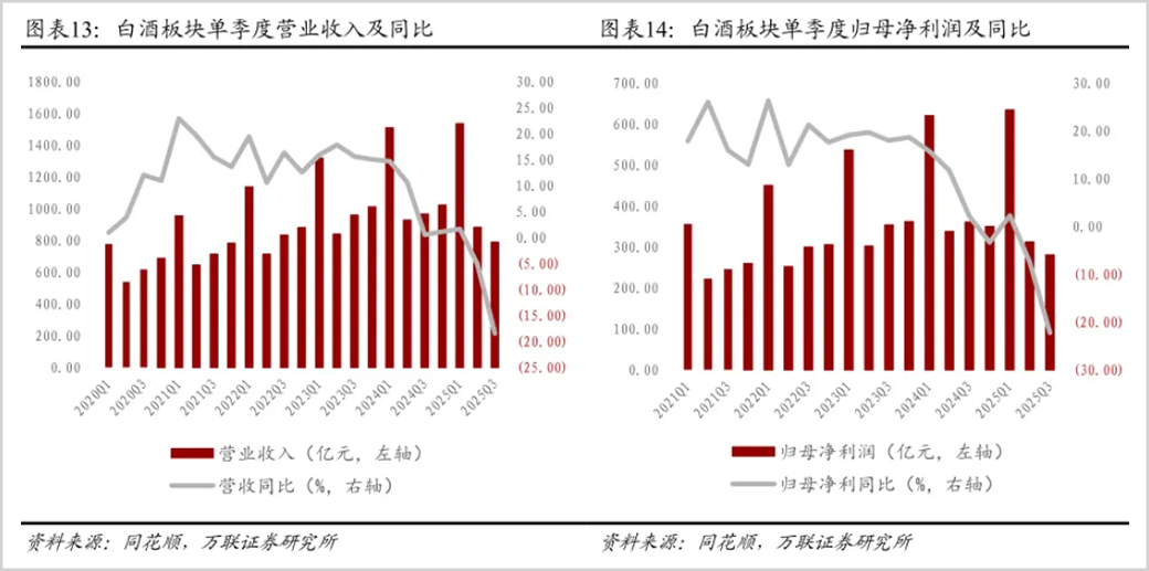 从上市公司的业绩表现也能窥知一二。据万联证券研究,2025年第三季度白酒板块实现归母净利润280.6亿,同比下滑22%,不仅创出了本轮周期内最大单季回撤,也显著超过了上轮2012年至2015年调整期的任何一个季度。