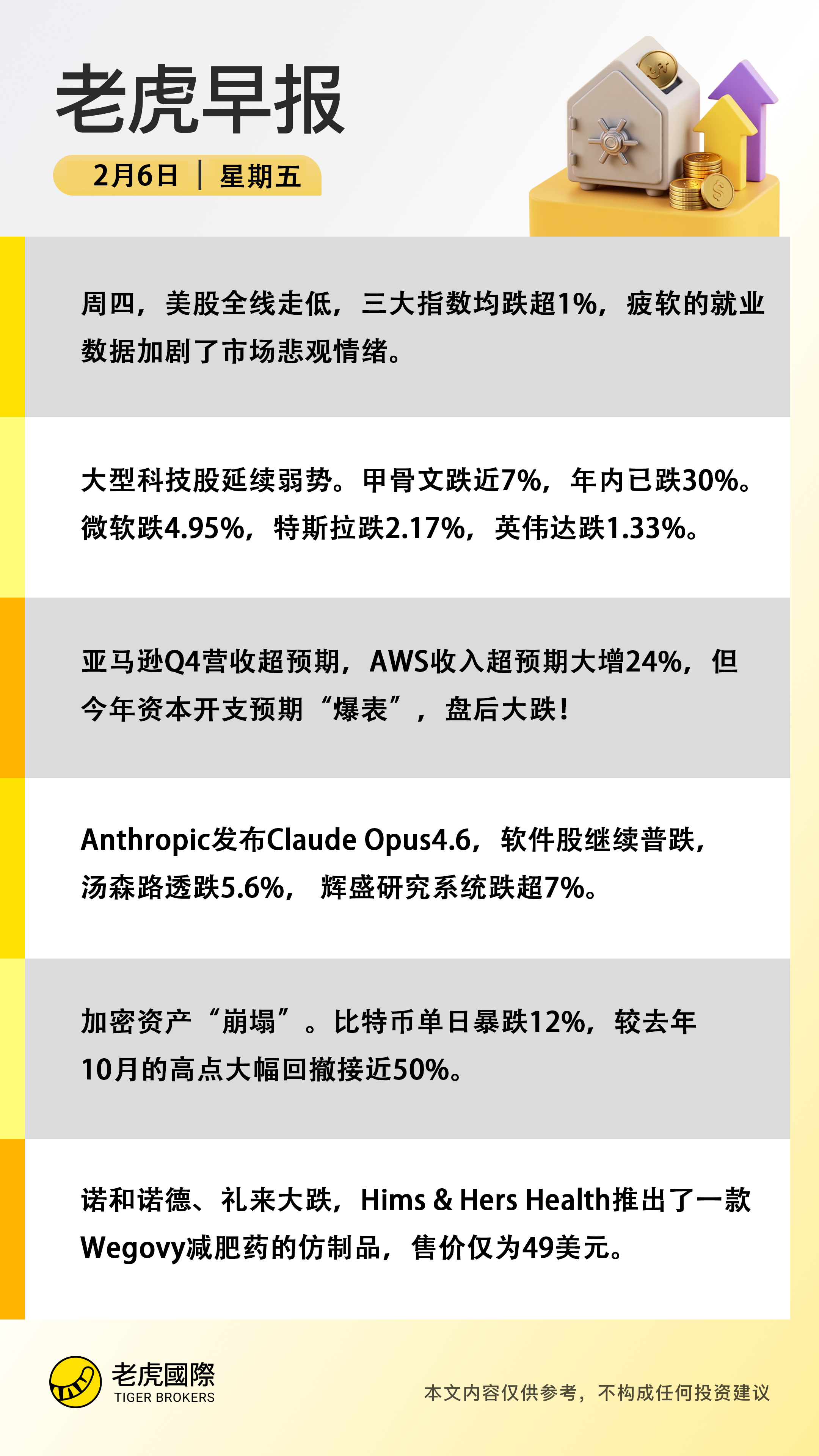 2月5日周四,美股三大指数集体收跌。道琼斯指数跌1.20%,报48908.72点;标普500指数跌1.23%,报6798.40点;纳斯达克综合指数跌1.59%,报22540.59点。美国12月JOLTS职位空缺创五年多新低,远低于预期。美国挑战者企业1月裁员10.8万人,创2009年以来同期新高,环比激增205%。