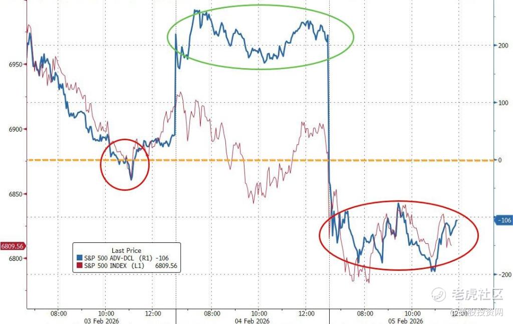 市场的抛售广度正在显著扩大。周四标普500指数内部的下跌个股家数远超上涨家数,即便是剔除了权重股影响的等权重指数也录得显著下跌。这意味着,市场的波动不再局限于头部的几只科技巨头,而是全面蔓延至金融、工业及传统服务业。