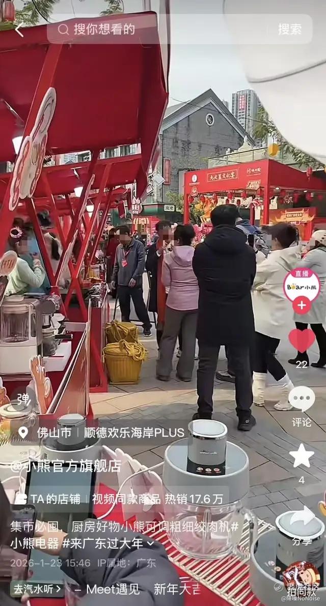 1月23日,小熊电器就将直播间搬到佛山顺德华侨城欢乐海岸PLUS设立的核心年味市集上。借助密密匝匝的喜庆展位,小熊厨电产品同醒狮、咏春等非遗大秀,以及花车巡游、长桌宴等热闹年俗场景一起融入直播间画面,带给用户耳目一新的感受。