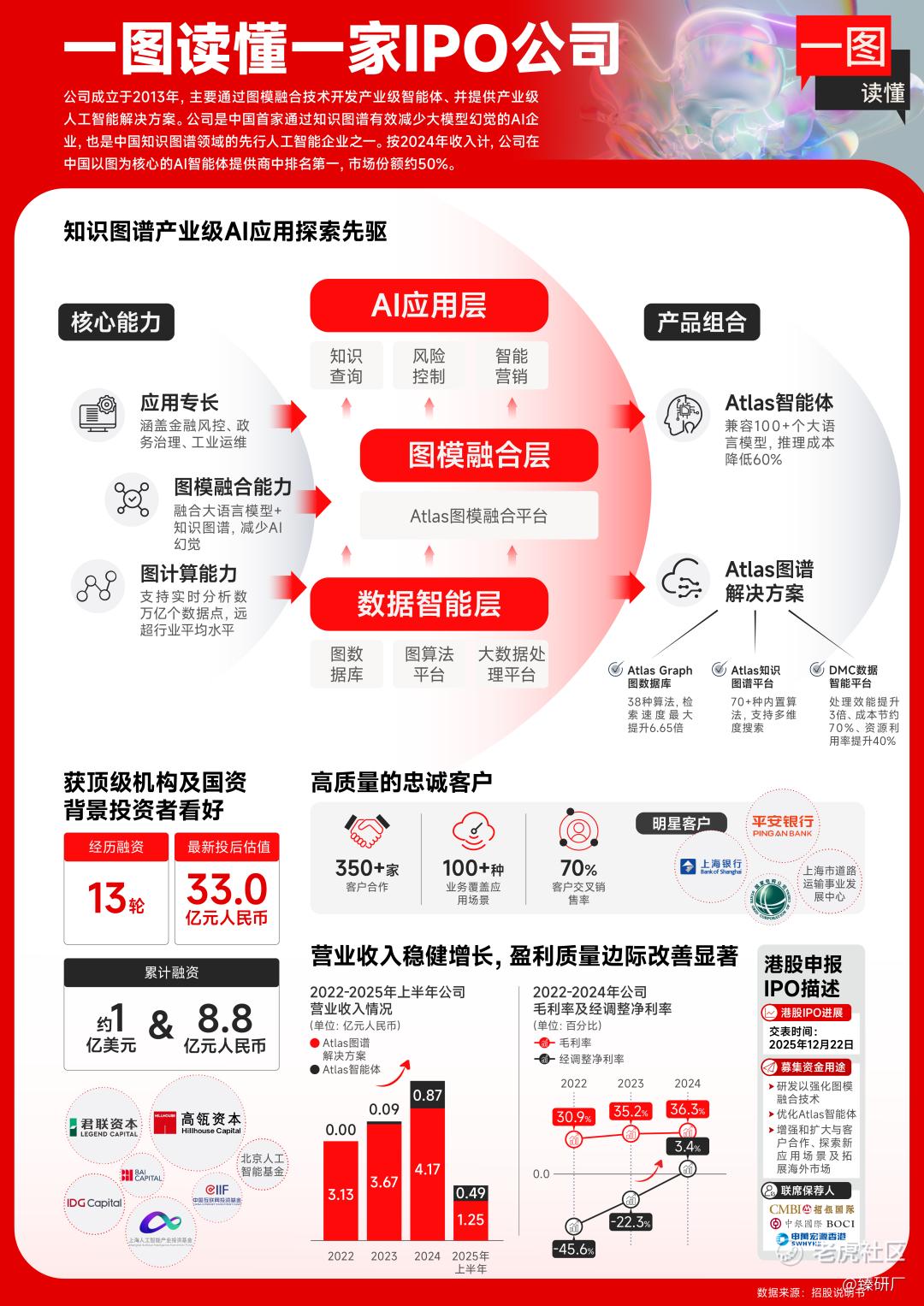 公司成立于2013年,主要通过图模融合技术开发产业级智能体、并提供产业级人工智能解决方案。公司是中国首家通过知识图谱有效减少大模型幻觉的AI企业,也是中国知识图谱领域的先行人工智能企业之一。按2024年收入计,公司在中国以图为核心的AI智能体提供商中排名第一,市场份额约50%。