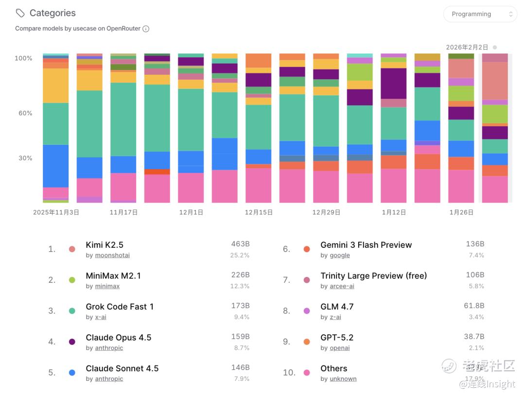 K2.5登顶OpenRouter大模型编程类调用量排行榜,图源OpenRouter网站