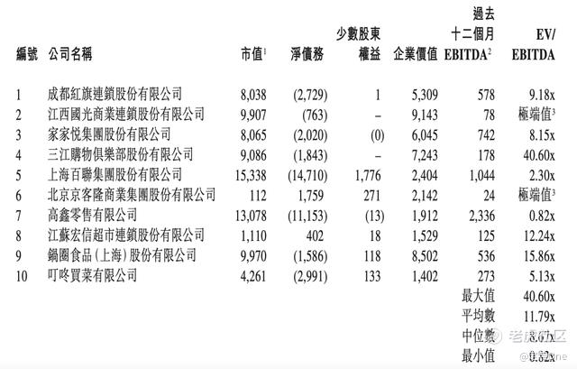 公告显示,估值方法采用市场法中的EV(企业价值)/EBITDA(息税折旧摊销前利润)倍数法。选取10家中国生鲜零售及电商上市公司作为可比公司,剔除个别极端值后,最终可比公司EV/EBITDA倍数中位数为8.67倍。
