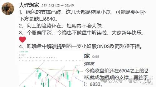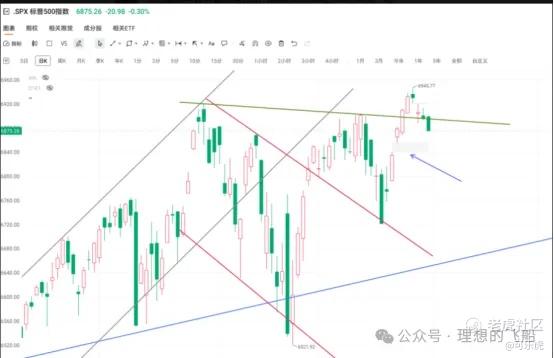 SPX两个交易日都站稳6881(同时QQQ站稳600)的话,就是反弹趋势了。图片里的绿线早在12月底就已经画给大家看了,大家可以模拟着画一根。