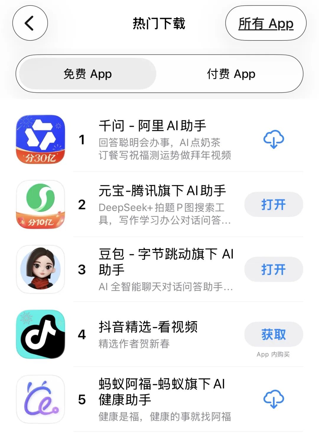 App Store免费总榜单排名中,前五款有四款都是AI助手产品,第一到第五名分别是:千问、元宝、豆包、抖音精选、蚂蚁阿福。