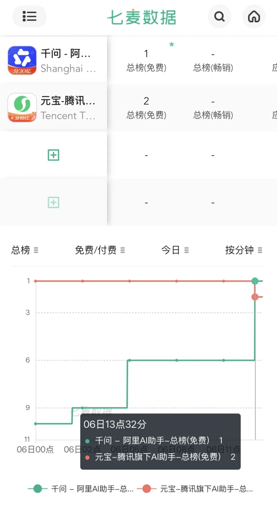 七麦数据显示,2026年2月6日下午1点32分,阿里巴巴旗下的AI助手产品千问反超元宝、豆包,登顶App Store免费总榜单第一。