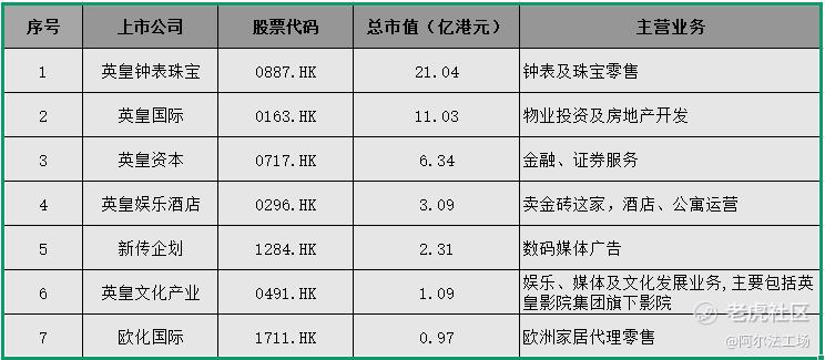 目前,杨受成的“英皇系”共有七家公司在港交所上市,分别为英皇钟表珠宝、英皇国际、英皇资本、英皇文化产业、英皇娱乐酒店(卖金砖这家)、新传企划以及欧化国际,涉及包括钟表及珠宝零售、物业投资及房地产开发、金融、酒店、媒体、娱乐、影院、家居等多个业务领域。