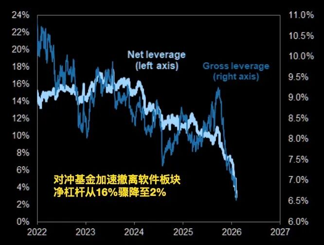 近期,对冲基金大幅削减了对软件行业的风险敞口,整体净杠杆已从约16%快速下降至接近2%,资金态度出现明显转向。