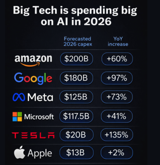 根据最新的财报指引,微软、META、谷歌与亚马逊在2026年的合计资本支出预计将达到约6500亿美元,同比增速高达60%。