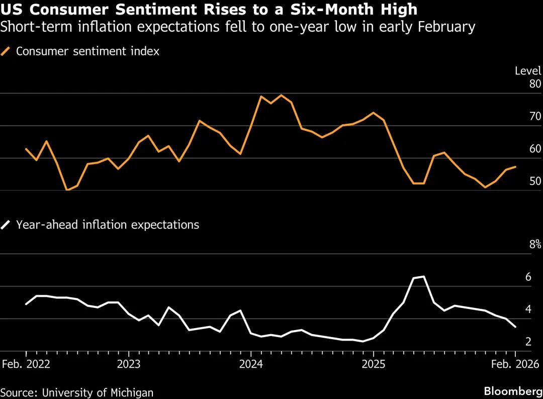 这轮反弹的直接触发因素,来自宏观数据对市场情绪的缓和。密歇根大学公布的数据显示,美国2月消费者信心指数意外升至六个月高点,同时1年期通胀预期降至13个月低位。