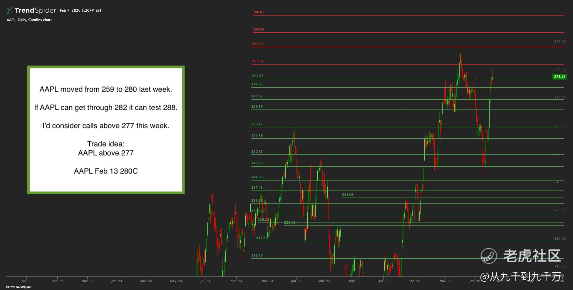 $AAPL (苹果):当前情绪看涨。过去 4 天从 259 强力拉升到了 278 。明天只要守住 277,就有望冲击 282 和 288 。