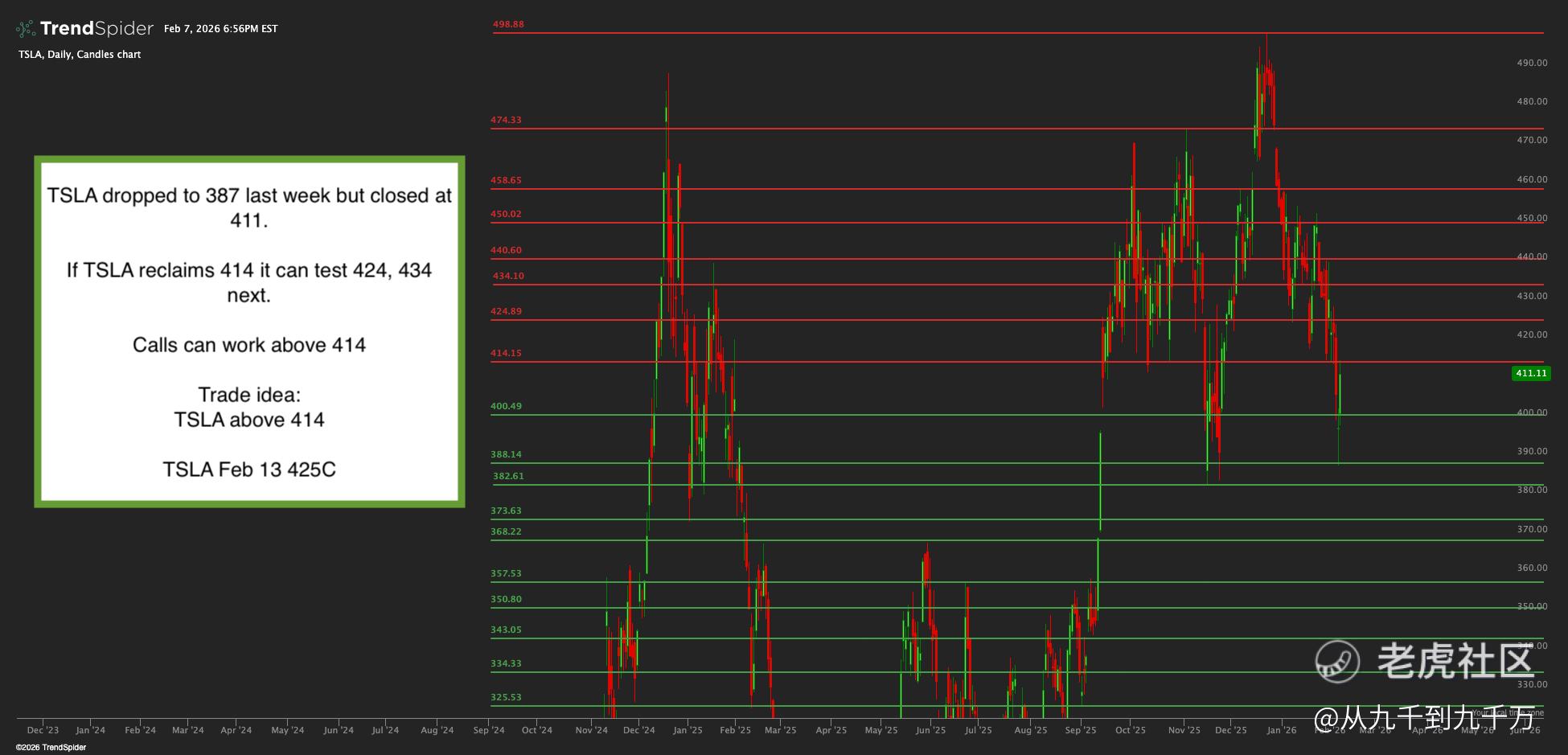 $TSLA (特斯拉):当前情绪看涨。跌破 400 后测试了 393,一旦失守 393 将看 384 。如果 384 也没守住,可能会出现恐慌性抛售(Flush)跌向 363 。重回 403 才是重返 414 的信号 。