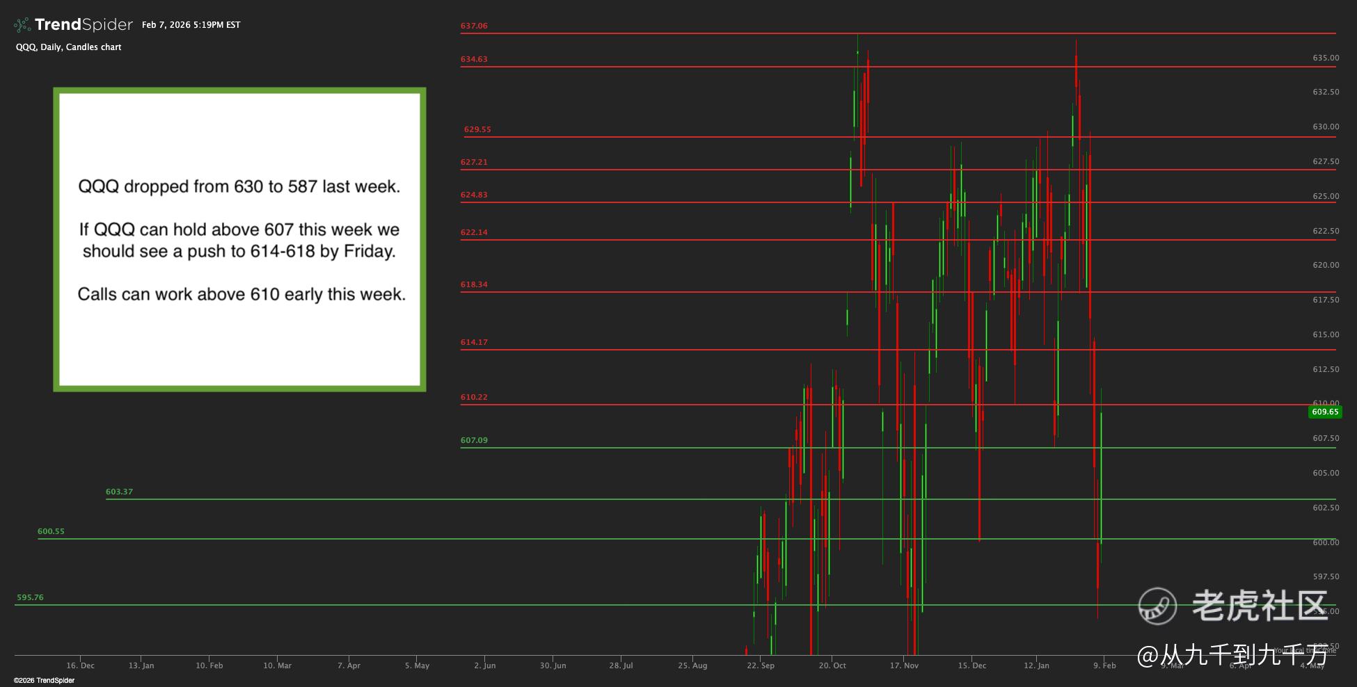 $QQQ (纳指100):当前情绪看涨。盘后在 586 站稳了,显示出一点点走强的迹象 。明天如果能冲破 600,目标看 606;如果跌破 589,就要小心跌向 581 。