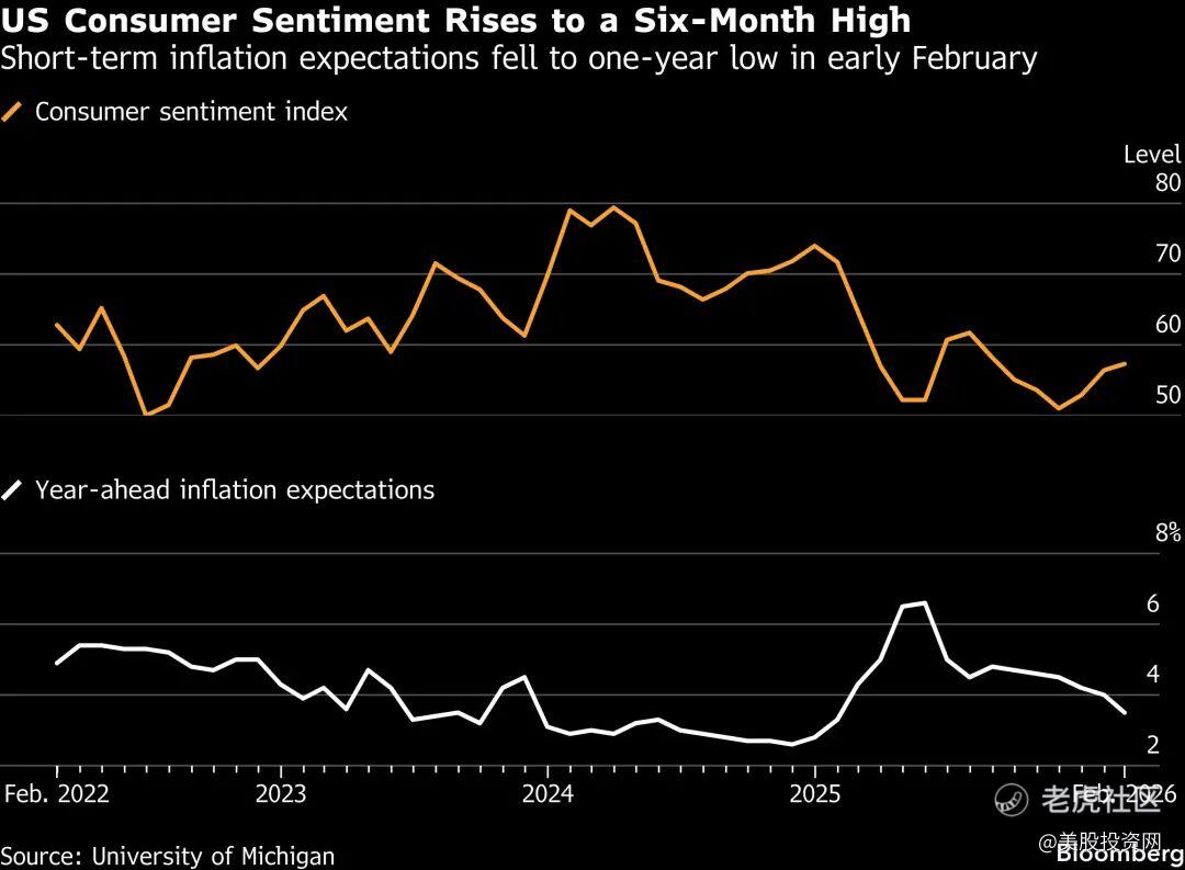 这轮反弹的直接触发因素,来自宏观数据对市场情绪的缓和。密歇根大学公布的数据显示,美国2月消费者信心指数意外升至六个月高点,同时1年期通胀预期降至13个月低位。