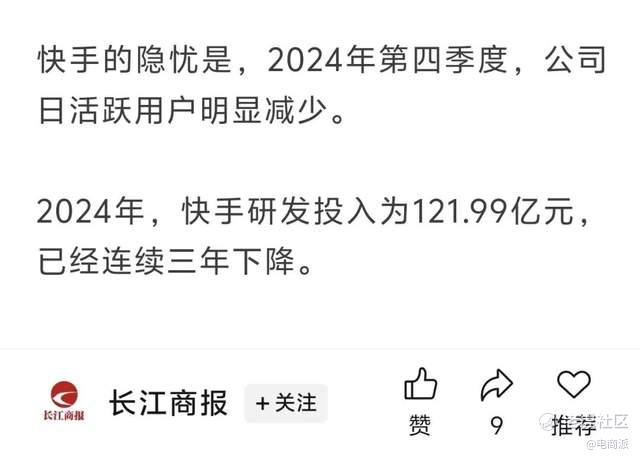 长江商报透露数据显示,2024年,快手研发投入为121.99亿元,已连续三年下降。