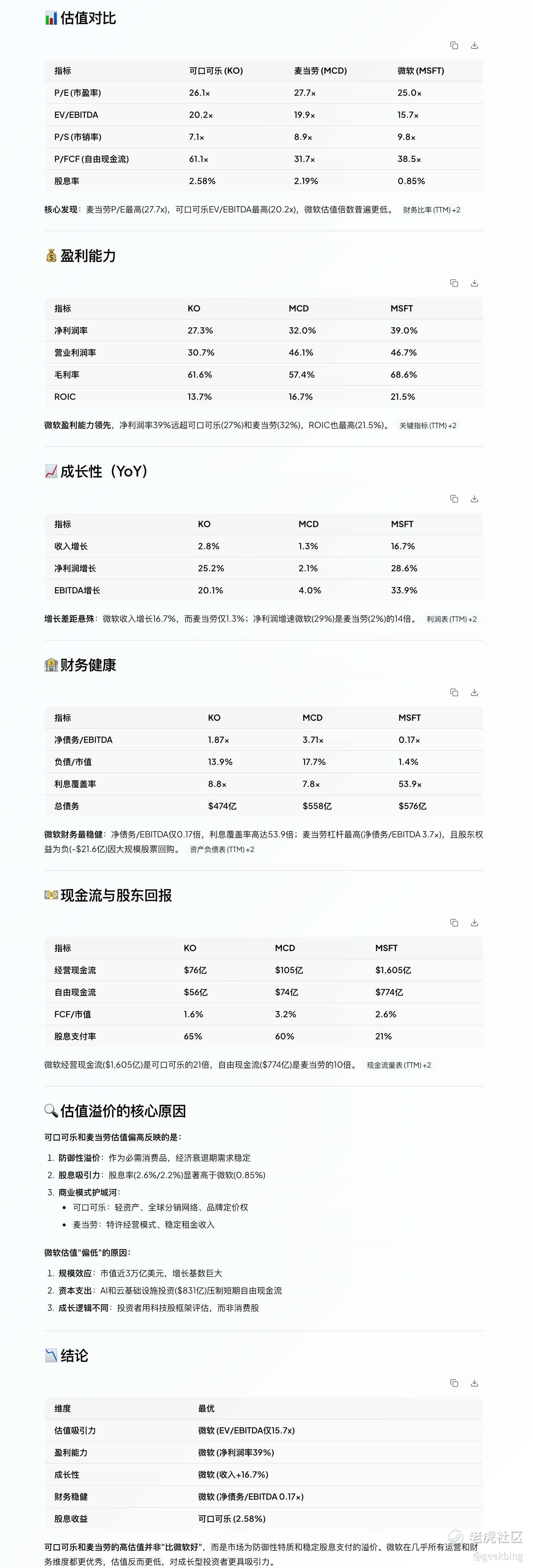随便问了 Agent 一个问题:“可口可乐跟麦当劳的估值已经比微软都要高了,从各个维度对比一下这三家公司”,看下来不同公司之间对比,还是 TTM 数据适合,因为时间窗口比较一致。