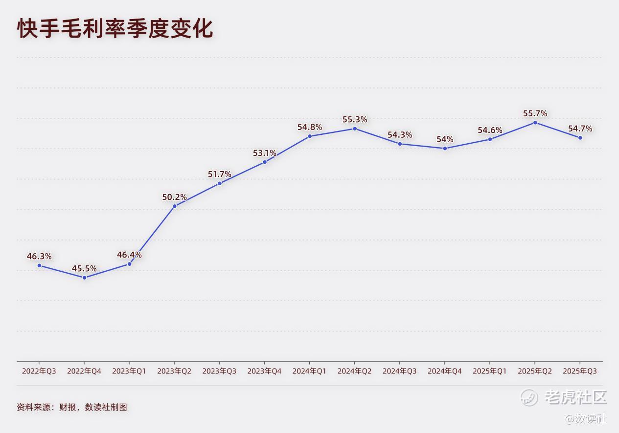 2023年、2024年,快手毛利率超过50%,这样的势头延续到2025年,三季度毛利率为54.7%。而在2022年,快手的毛利率只有44.7%。