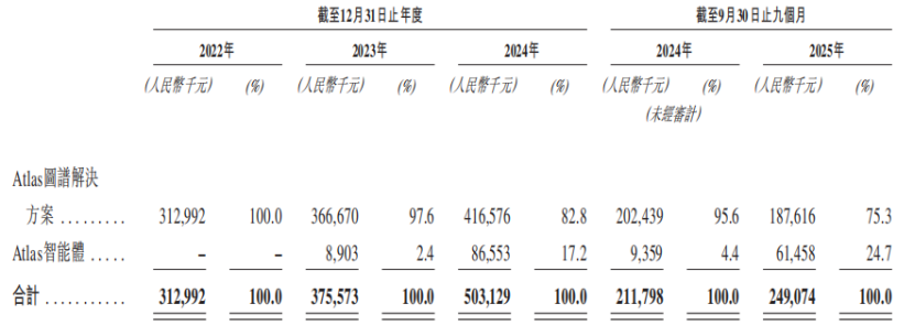 从收入结构来看,公司收入主要来源于Atlas图谱解决方案与Atlas智能体的销售,其中Atlas图谱解决方案作为核心基础产品,2024年贡献收入4.17亿元,占总营收的82.8%;Atlas智能体业务增长迅猛,收入从2023年的890万元激增至2024年的8660万元,增幅达872.2%,截至2025年1-9月,Atlas智能体的收入占比提升至24.7%,成为公司未来增长的核心引擎。