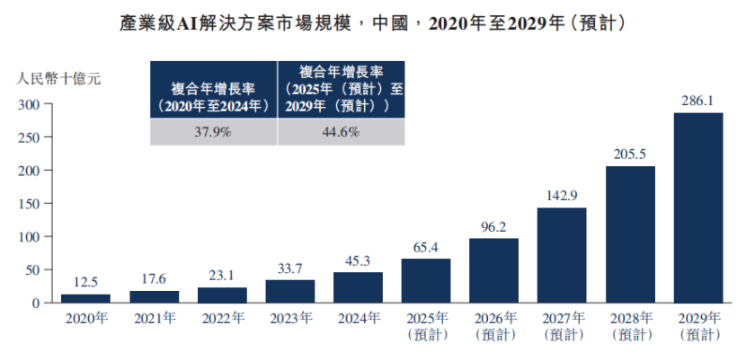 行业层面,中国产业级人工智能解决方案市场正处于高速增长阶段。根据弗若斯特沙利文数据,2024年中国产业级AI解决方案市场规模达453亿元,2020-2024年复合年增长率为37.9%;预计未来五年将保持44.6%的复合年增长率,2029年市场规模将增至2861亿元。其中,集成知识图谱的产业级AI智能体作为新兴细分赛道,增长势头更为迅猛,市场规模预计从2024年的2亿元增至2029年的132亿元,复合年增长率高达140.0%,主要动力为市场对减少大模型幻觉、增强行业适配性技术的强烈需求。政策层面,《新一代人工智能发展规划》《“人工智能+”行动》等国家战略的出台,为产业级AI的发展提供了良好的政策环境,各地政府通过建设算力基础设施、设立专项扶持资金等方式降低企业创新成本,加速AI技术在重点行业的渗透。