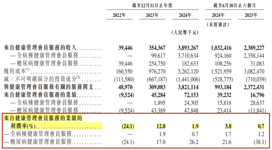 2025H1,由于糖尿病管理服务得分较低,盈余分成大幅减少,健康管理会员服务板块的利润率大幅下滑至0.7%。