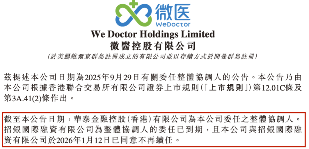 但近期,微医披露:招银国际为整体协调人的委任已到期,将不再续任。