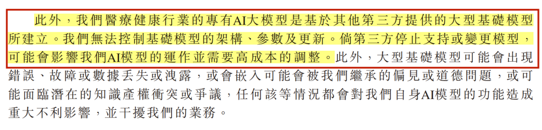 其在招股书中坦言:医疗健康行业的专有AI大模型,是基于第三方基础大模型所建立,无法控制架构、参数及更新。