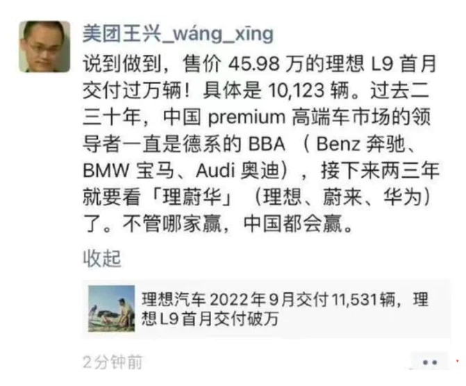 初代理想L9首月交付破万,曾让理想汽车股东、美团CEO王兴为之振奋