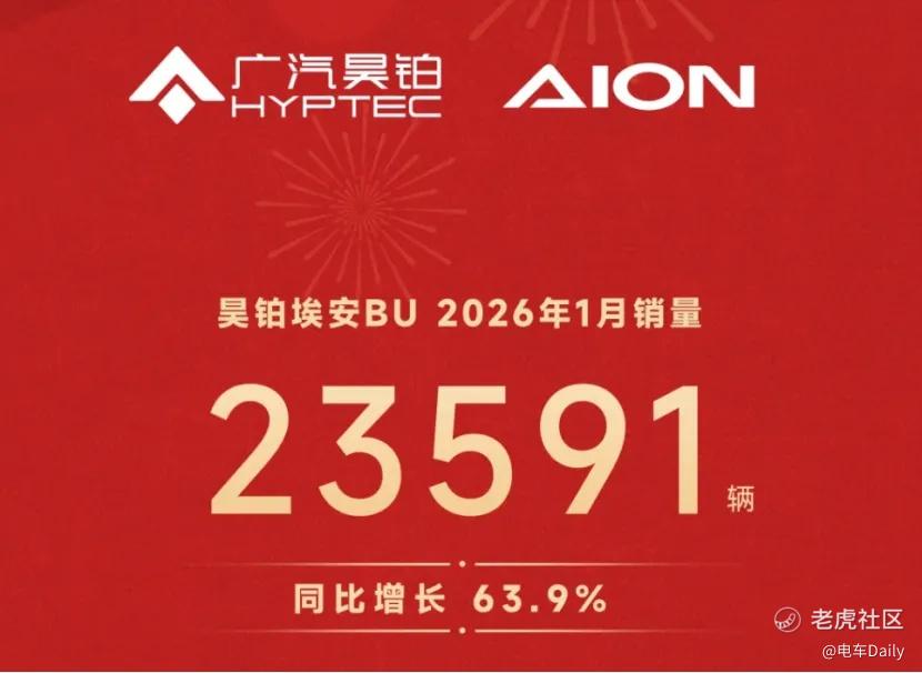 2月1日,昊铂埃安BU公布首份完整月度成绩单:1月终端销量达23,591辆,同比激增63.9%。