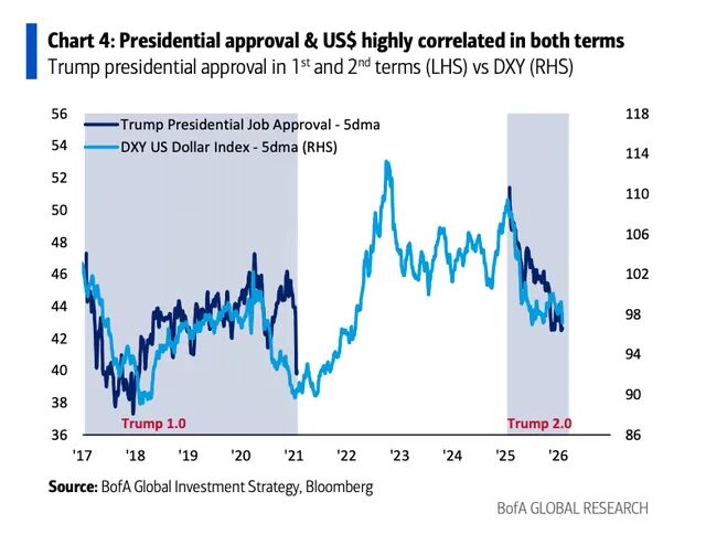然而进入 2026 年以来,由于主要经济体政策环境的变化及美联储降息预期的博弈,美元指数在 1 月末出现了明显的技术性调整。此时,支持率的波动被市场解读为民众对现有经济治理成效的反馈,进而直接影响了此前过度拥挤的 “强美元交易” 进行获利回吐。