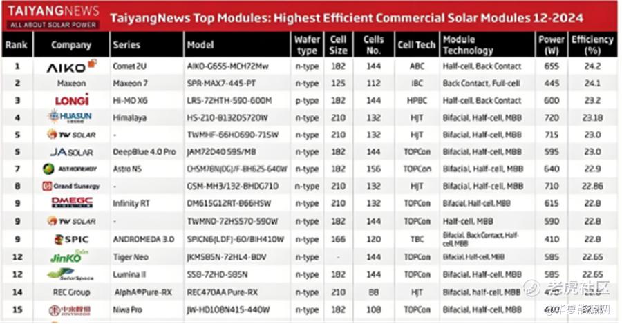 海外媒体Taiyang news公布的2024年12月全球光伏组件转换效率排行榜上,爱旭、Maxeon位列冠亚军(图源:Taiyang news)