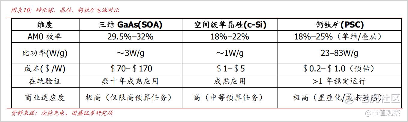 据国盛证券研究,钙钛矿叠层电池的最高实验室效率约35%,预估成本不足7元每瓦,较砷化镓电池显著下降。