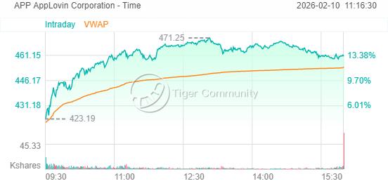 移动广告技术公司$AppLovin(APP)$股价近期呈现剧烈震荡。2月10日美股盘中,该股一度冲高至471.73美元,日内涨幅约13%,随后夜盘交易中继续上探至约482美元附近。近五个交易日,股价整体在经历上周的阶段性回撤后,于本周初快速反弹。