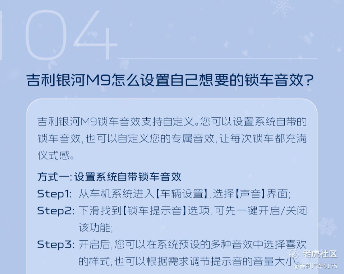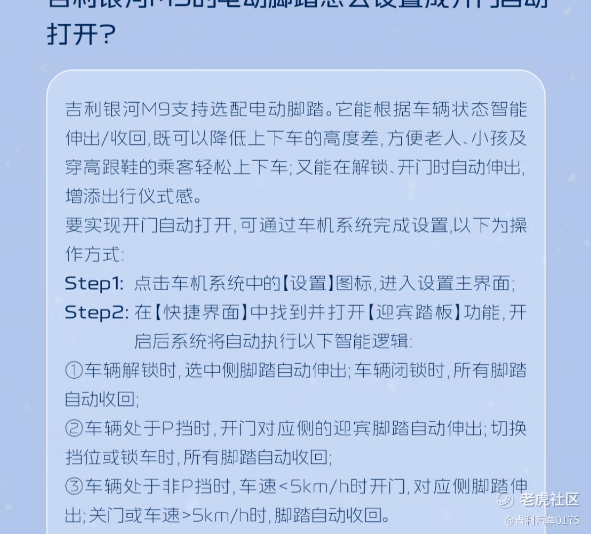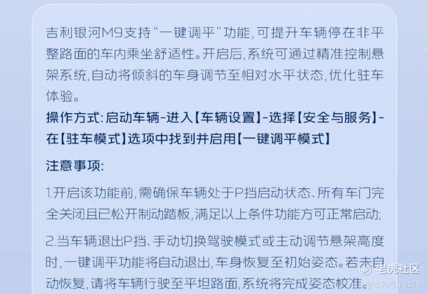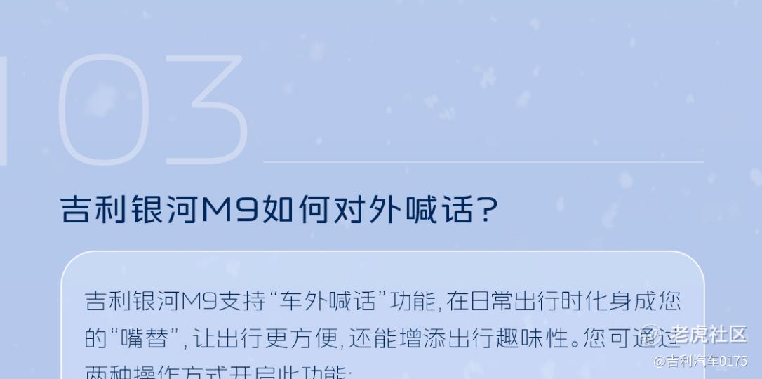 {"i18n":{"language":"zh_CN"},"detailType":1,"isChannel":false,"data":{"magic":2,"id":531146499973992,"tweetId":"531146499973992","gmtCreate":1770695412814,"gmtModify":1770697491213,"author":{"id":3570925126401945,"idStr":"3570925126401945","authorId":3570925126401945,"authorIdStr":"3570925126401945","name":"吉利汽车0175","avatar":"https://static.tigerbbs.com/3f1b7526951e77ea7c2ad4b9151f5cf0","vip":5,"userType":5,"introduction":"吉利汽车集团官方账号","boolIsFan":false,"boolIsHead":false,"crmLevel":1,"crmLevelSwitch":0,"individualDisplayBadges":[],"fanSize":7430,"starInvestorFlag":false},"themes":[],"images":[{"img":"https://static.tigerbbs.com/15fd83988c72fb640fb4ec8dd6868bc6","width":"1080","height":"714"},{"img":"https://static.tigerbbs.com/8dd22ad2a539528ff806530e38a30e23","width":"1082","height":"514"},{"img":"https://static.tigerbbs.com/a9593bf8220eef8e717d8f226844e636","width":"1084","height":"742"},{"img":"https://static.tigerbbs.com/7b19ab34a1e8d1228680be2b6ea6232f","width":"1442","height":"990"},{"img":"https://static.tigerbbs.com/152be5945d28cf51f408602fc30ad73d","width":"1082","height":"634"},{"img":"https://static.tigerbbs.com/7ac310bdbb395e7a7748d0ae9bec7fe8","width":"1088","height":"940"},{"img":"https://static.tigerbbs.com/222161d4acb6364dcf7c0d14e38f3c38","width":"1084","height":"646"},{"img":"https://static.tigerbbs.com/e9afdb12516d1298df8d17c625c1dd0f","width":"1086","height":"540"},{"img":"https://static.tigerbbs.com/7a18831294081ef93e9124ad8d82af2b","width":"1200","height":"826"},{"img":"https://static.tigerbbs.com/05e532fd452a1e252e9164b27de0503c","width":"1198","height":"710"},{"img":"https://static.tigerbbs.com/4b8d03d8a16d46cc973d0f49a8bfc631","width":"1194","height":"952"},{"img":"https://static.tigerbbs.com/1e7dbb6288adac6b512c607eda0be708","width":"1196","height":"670"},{"img":"https://static.tigerbbs.com/2a47cce1d1c117010035da545b0ca95c","width":"1196","height":"1002"},{"img":"https://static.tigerbbs.com/9b6f6ffd35b4acdb0781c50df1e233f9","width":"1076","height":"152"},{"img":"https://static.tigerbbs.com/f79d25c109e2612807a08abad2609fa7","width":"1196","height":"690"},{"img":"https://static.tigerbbs.com/e863060b6279c7a5fbc0101948404238","width":"1194","height":"754"},{"img":"https://static.tigerbbs.com/54e41b97a42fbd381738982d78380117","width":"1192","height":"338"},{"img":"https://static.tigerbbs.com/0f35b23a6e7e97ed796c922d5b7e4ebb","width":"1196","height":"1080"},{"img":"https://static.tigerbbs.com/c7a5a5557abceac2d0af48bf03255c4d","width":"1194","height":"1096"},{"img":"https://static.tigerbbs.com/c0e9c1cd9119d4fc6cb21a9c33cefb13","width":"1192","height":"1080"},{"img":"https://static.tigerbbs.com/15296c77c78f6d5e9614adcebf1af945","width":"1196","height":"1078"}],"coverImages":[{"img":"https://static.tigerbbs.com/15fd83988c72fb640fb4ec8dd6868bc6","width":"1080","height":"714"},{"img":"https://static.tigerbbs.com/8dd22ad2a539528ff806530e38a30e23","width":"1082","height":"514"},{"img":"https://static.tigerbbs.com/a9593bf8220eef8e717d8f226844e636","width":"1084","height":"742"}],"title":"吉利银河M9答网友问(第八期)","html":"<html><head></head><body><p>吉利银河M9答网友问第八期 新鲜出炉,为你解决每一个用车困惑!</p>\n<p class=\"t-img-caption\"><img src=\"https://static.tigerbbs.com/15fd83988c72fb640fb4ec8dd6868bc6\" tg-width=\"1080\" tg-height=\"714\"></p>\n<p class=\"t-img-caption\"><img src=\"https://static.tigerbbs.com/8dd22ad2a539528ff806530e38a30e23\" tg-width=\"1082\" tg-height=\"514\"></p>\n<p class=\"t-img-caption\"><img src=\"https://static.tigerbbs.com/a9593bf8220eef8e717d8f226844e636\" tg-width=\"1084\" tg-height=\"742\"></p>\n<p class=\"t-img-caption\"><img src=\"https://static.tigerbbs.com/7b19ab34a1e8d1228680be2b6ea6232f\" tg-width=\"1442\" tg-height=\"990\"></p>\n<p class=\"t-img-caption\"><img src=\"https://static.tigerbbs.com/152be5945d28cf51f408602fc30ad73d\" tg-width=\"1082\" tg-height=\"634\"></p>\n<p class=\"t-img-caption\"><img src=\"https://static.tigerbbs.com/7ac310bdbb395e7a7748d0ae9bec7fe8\" tg-width=\"1088\" tg-height=\"940\"></p>\n<p class=\"t-img-caption\"><img src=\"https://static.tigerbbs.com/222161d4acb6364dcf7c0d14e38f3c38\" tg-width=\"1084\" tg-height=\"646\"></p>\n<p class=\"t-img-caption\"><img src=\"https://static.tigerbbs.com/e9afdb12516d1298df8d17c625c1dd0f\" tg-width=\"1086\" tg-height=\"540\"></p>\n<p class=\"t-img-caption\"><img src=\"https://static.tigerbbs.com/7a18831294081ef93e9124ad8d82af2b\" tg-width=\"1200\" tg-height=\"826\"></p>\n<p class=\"t-img-caption\"><img src=\"https://static.tigerbbs.com/05e532fd452a1e252e9164b27de0503c\" tg-width=\"1198\" tg-height=\"710\"></p>\n<p class=\"t-img-caption\"><img src=\"https://static.tigerbbs.com/4b8d03d8a16d46cc973d0f49a8bfc631\" tg-width=\"1194\" tg-height=\"952\"></p>\n<p class=\"t-img-caption\"><img src=\"https://static.tigerbbs.com/1e7dbb6288adac6b512c607eda0be708\" tg-width=\"1196\" tg-height=\"670\"></p>\n<p class=\"t-img-caption\"><img src=\"https://static.tigerbbs.com/2a47cce1d1c117010035da545b0ca95c\" tg-width=\"1196\" tg-height=\"1002\"></p>\n<p class=\"t-img-caption\"><img src=\"https://static.tigerbbs.com/9b6f6ffd35b4acdb0781c50df1e233f9\" tg-width=\"1076\" tg-height=\"152\"></p>\n<p class=\"t-img-caption\"><img src=\"https://static.tigerbbs.com/f79d25c109e2612807a08abad2609fa7\" tg-width=\"1196\" tg-height=\"690\"></p>\n<p class=\"t-img-caption\"><img src=\"https://static.tigerbbs.com/e863060b6279c7a5fbc0101948404238\" tg-width=\"1194\" tg-height=\"754\"></p>\n<p class=\"t-img-caption\"><img src=\"https://static.tigerbbs.com/54e41b97a42fbd381738982d78380117\" tg-width=\"1192\" tg-height=\"338\"></p>\n<p class=\"t-img-caption\"><img src=\"https://static.tigerbbs.com/0f35b23a6e7e97ed796c922d5b7e4ebb\" tg-width=\"1196\" tg-height=\"1080\"></p>\n<p class=\"t-img-caption\"><img src=\"https://static.tigerbbs.com/c7a5a5557abceac2d0af48bf03255c4d\" tg-width=\"1194\" tg-height=\"1096\"></p>\n<p class=\"t-img-caption\"><img 