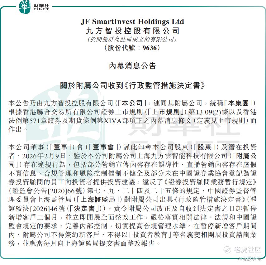 2月9日,九方智投发布公告称,鉴于附属公司上海九方云智能科技存在违规行为,包括部分营销宣传内容存在误导性、直播营销内容存在虚假不实信息、合规管理和风险控制机制不健全及部分未在中国证券业协会登记为证券投资顾问的员工向投资者提供投资建议,违反了相关规定。