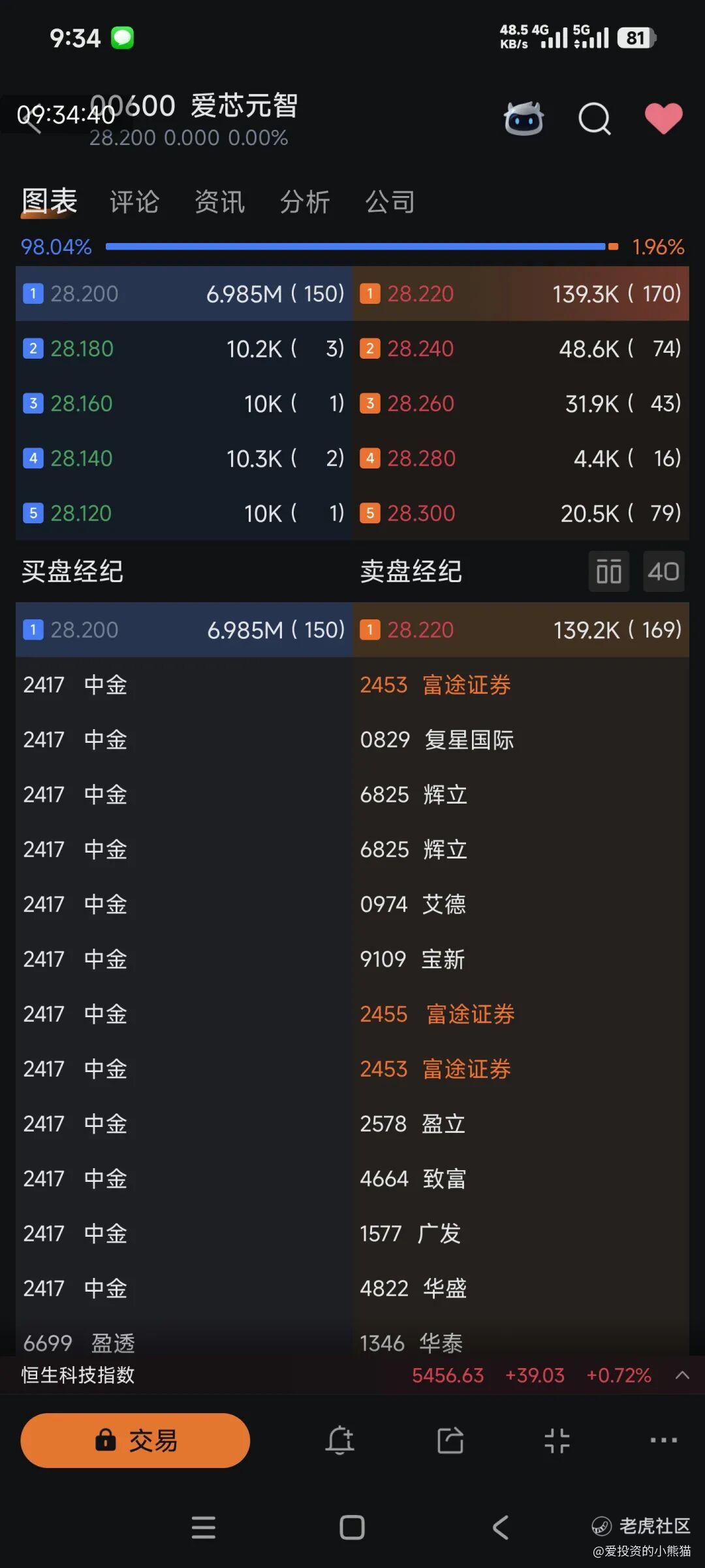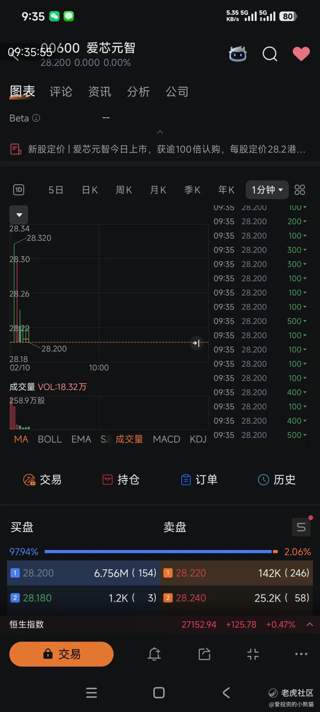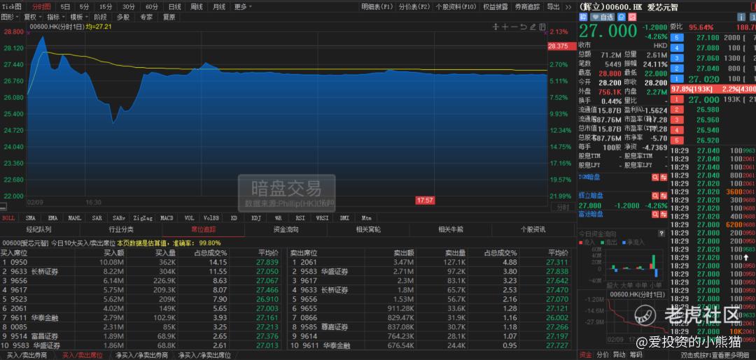 另一个形成鲜明对比的爱芯元智作为“中国边缘AI芯片第一股”,其上市开盘价为28.2港元,与每股28.2港元的发行价完全持平,该股早盘平开后一度出现小幅下探,但很快企稳并开始震荡上行,盘中最高触及29.10港元,而最低价格则始终维持在发行价附近,未出现明显的恐慌性抛盘 。从交易活跃度来看,爱芯元智整体交易相对平稳,资金关注度一般,与同期上市的乐欣户外形成了鲜明对比,截至午间收盘,其股价定格在28.48港元,较发行价上涨0.99%。基本上就是保发行了。这次稳价人中金就很卖力护盘了,这个票我们基本上没参与了,仓位都去钓鱼佬那票了。