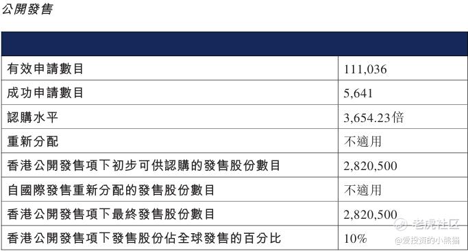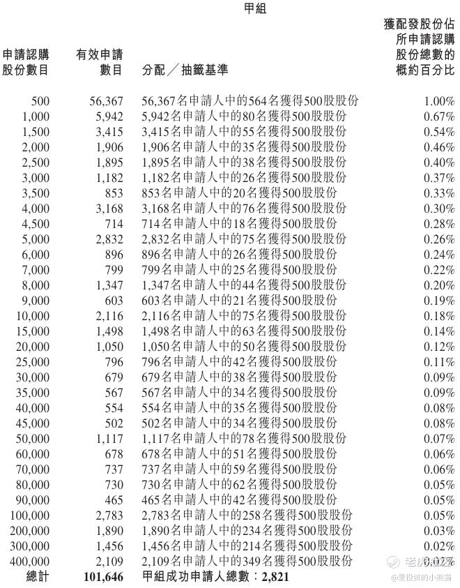 配售情况:111036人认购,这次公配3654.23倍,由于机制B分配,无回拨比率,国配有2.94倍,一手中签率1.00%,公开认购不能稳中1手,同时乙组9390人申购,其中顶头槌申购2144张,获配率0.02%。