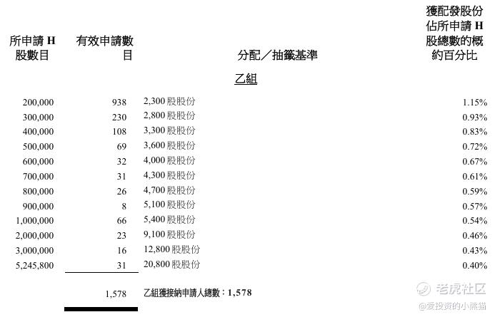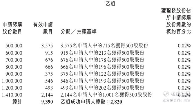 乐欣户外(02720.HK)乙组官方披露的中签名单:
