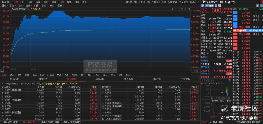 乐欣户外(02720.HK)辉立暗盘以21.50港元高开,立马回落至最低点16.00港元企稳,再震荡上行,最高摸到26.00港元,尾盘以24.60港元报收,涨幅为100.82%,振幅81.63%,成交2590万港元。