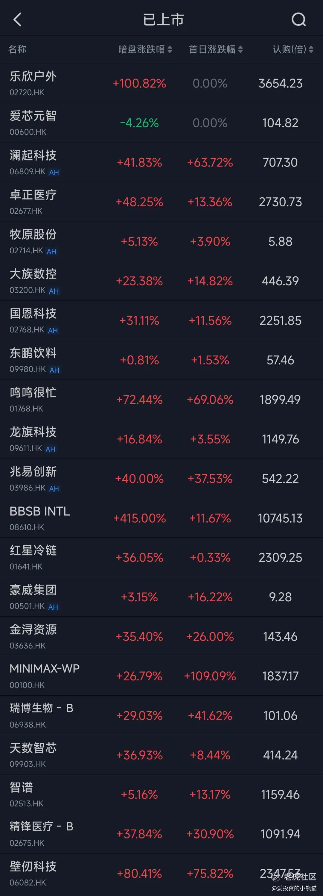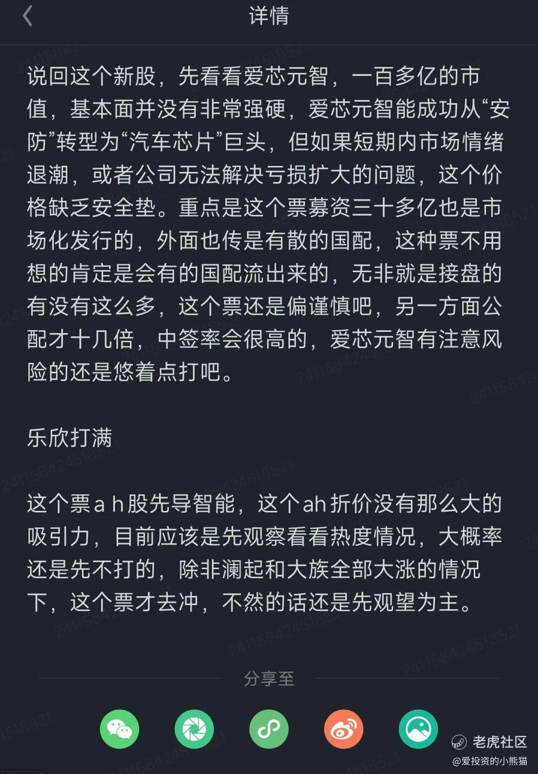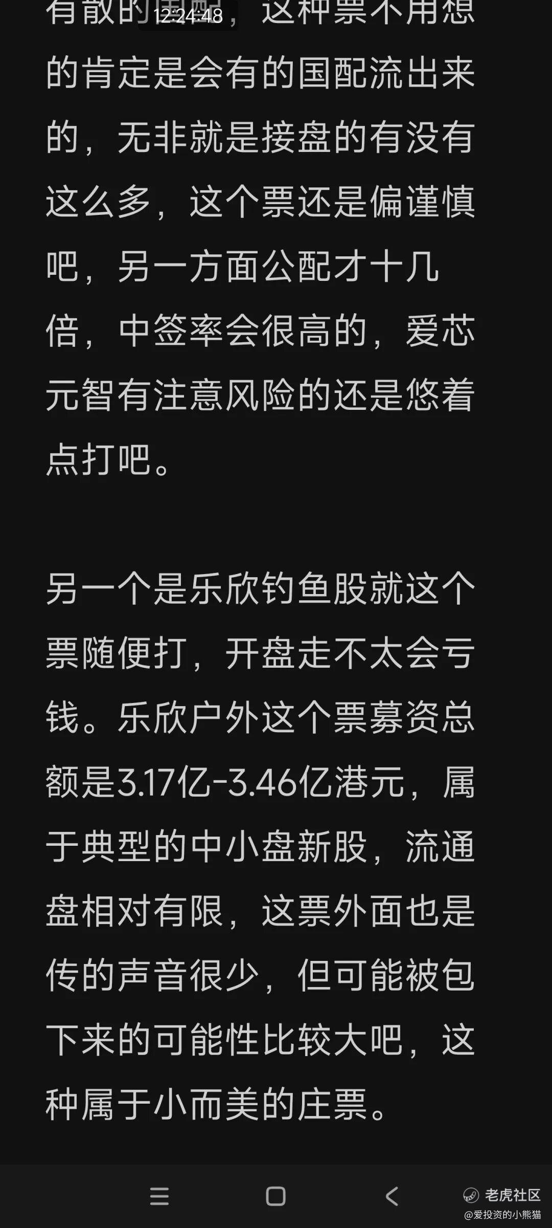 之前在xq里就建议乐欣满打,爱芯悠着点打,结果暗盘乐欣翻倍,爱芯跌4个多点,不过首日爱芯在中金的大力护盘下没有破发。爱芯元智,一百多亿的市值,基本面并没有非常强硬,爱芯元智能成功从“安防”转型为“汽车芯片”巨头,但如果短期内市场情绪退潮,或者公司无法解决亏损扩大的问题,这个价格缺乏安全垫。重点是这个票募资三十多亿也是市场化发行的,外面也传是有散的国配,这种票不用想的肯定是会有的国配流出来的,无非就是接盘的有没有这么多,这个票还是偏谨慎吧,另一方面公配才十几倍,中签率会很高的,爱芯元智有注意风险的还是悠着点打吧。另一个是乐欣钓鱼股就这个票随便打,开盘走,乐欣户外这个票募资总额是3.17亿-3.46亿港元,属于典型的中小盘新股,流通盘相对有限,这票可能被包下来的可能性比较大吧,这种属于小而美的庄票。