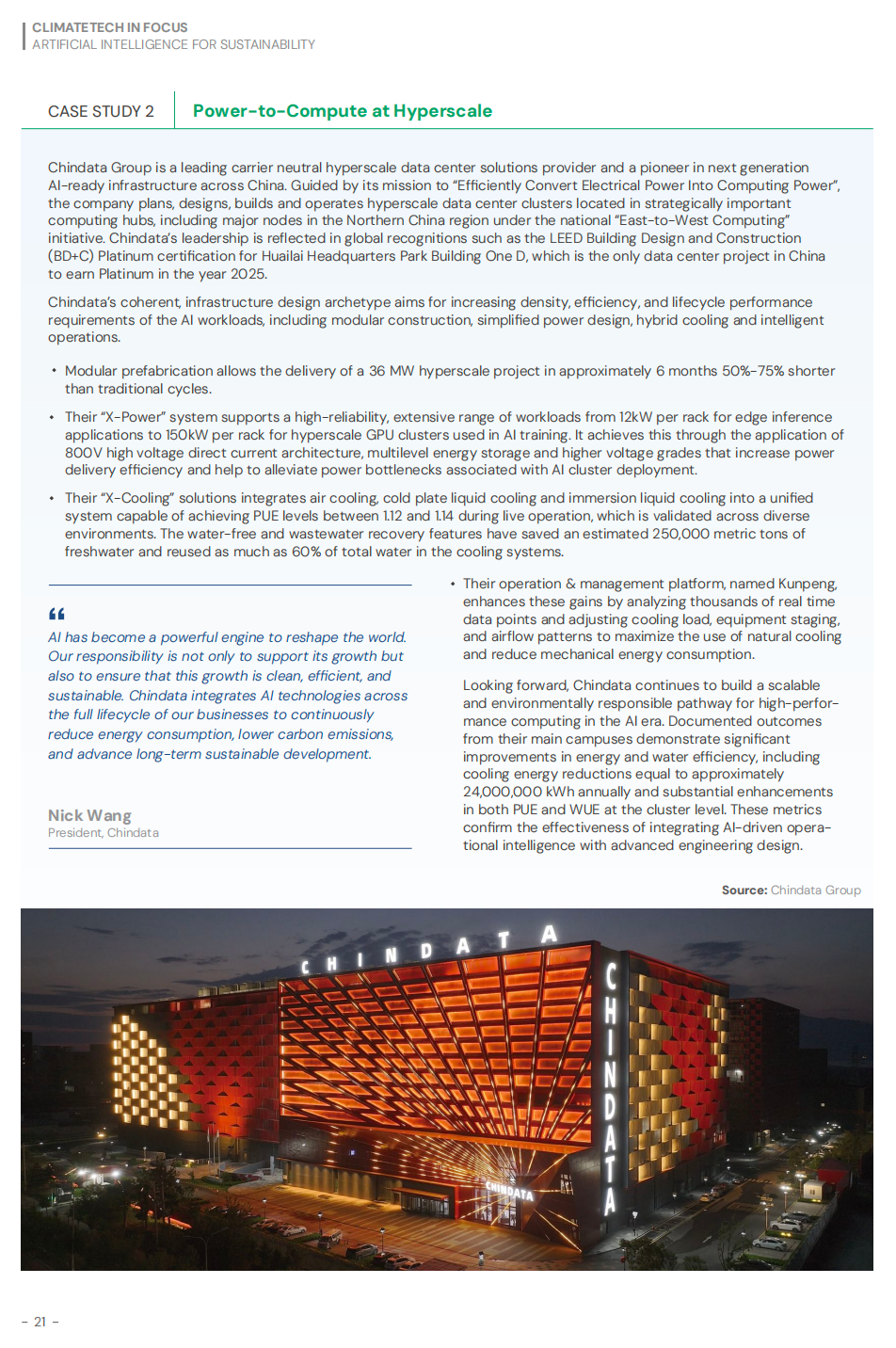 近期,由联合国及亚太经合组织(APEC)相关机构、上海气候周联合发起的年度旗舰研究成果——《气候科技焦点:人工智能赋能可持续发展》(ClimateTech In Focus: Artificial Intelligence for Sustainability)发布。该报告系统梳理了由 AI 驱动的可持续解决方案,从能源系统、基础设施、制造业、物流、金融及公共治理等关键领域,甄选出全球11项AI赋能可持续发展的标杆案例。秦淮数据凭借电力向算力高效转化的创新实践成功入选,成为案例中唯一一家中立第三方超大规模数据中心企业,充分彰显了秦淮数据在数据中心领域AI应用与绿色发展的领先优势。