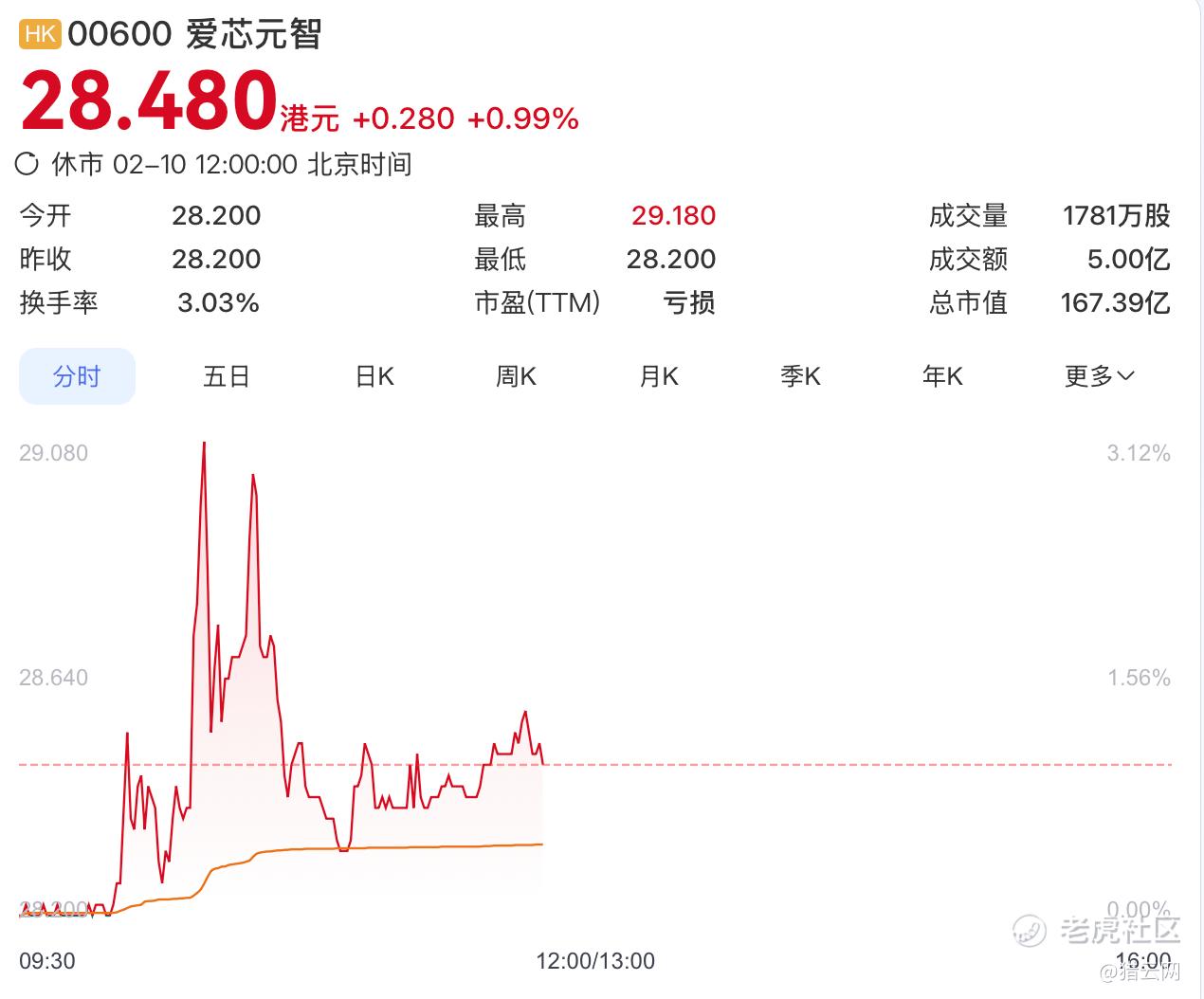 今日,爱芯元智以发行价开盘后,盘中最高触及29.18港元。截至午间休市,爱芯元智微涨0.99%报28.48港元,总市值167.39亿港元。