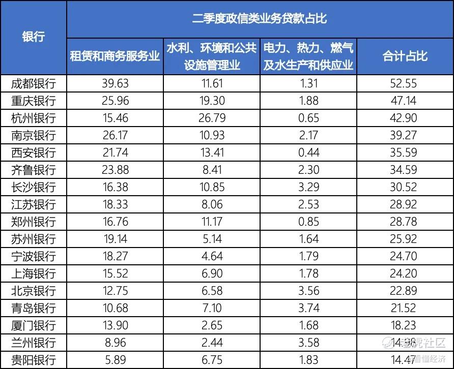 虽然业绩快报以及2025三季报中并未披露贷款结构分布数据,但据《看懂经济》统计,在2025年二季度上市城商行中,杭州银行政信类贷款占比位居前列。